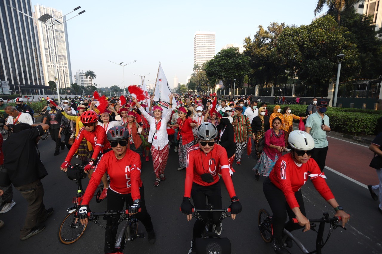 Perempuan Berkebaya Indonesia (PBI) dan Pertiwi Indonesia menggelar acara jalan santai Berkebaya di sepanjang jalan Sudirman, Minggu (19/06/2022). Acara ini sebagai bentuk dukungan untuk mendaftarkan kebaya ke Unesco menjadi warisan budaya tak Benda asal Indonesia.