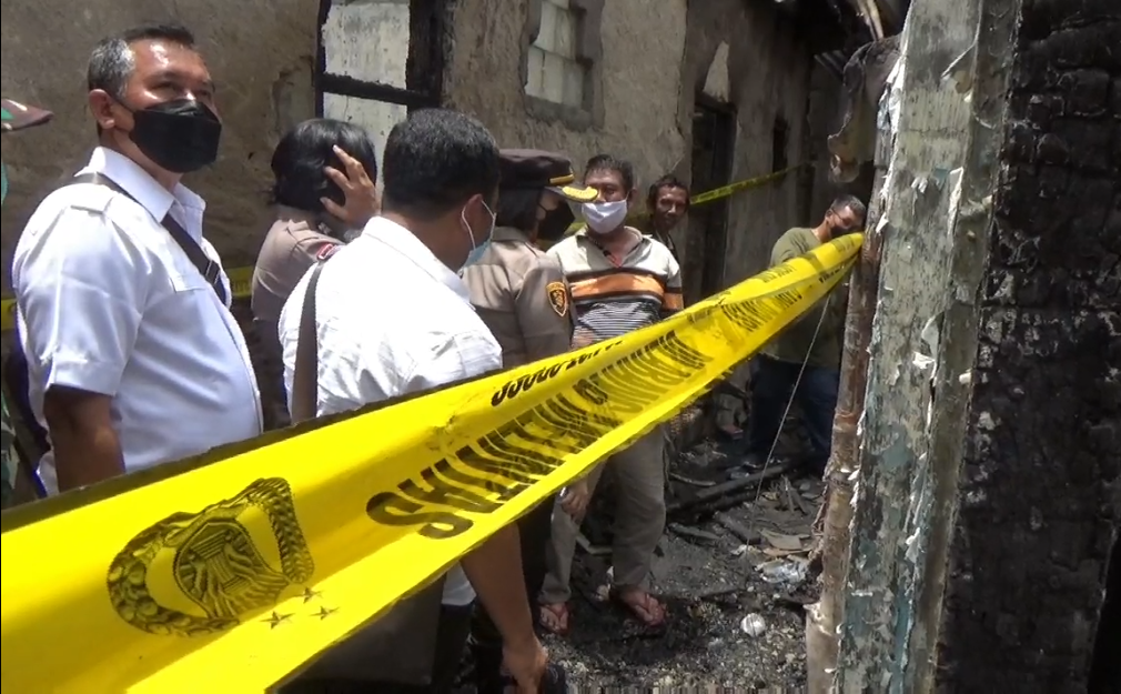 Anggota unit reskrim polsek tambora kembali melakukan olah tempat kejadian perkara di lokasi kebakaran di Jalan Sawah Lio, Jembatan Lima, Tambora Jakarta Barat, senin (28/3/2022). Hasilnya polisi menyimpulkan,kebakaran yang terjadi minggu (27/03) dilakukan oleh warga yang merupakan orang dengan gangguan jiwa (ODGJ).